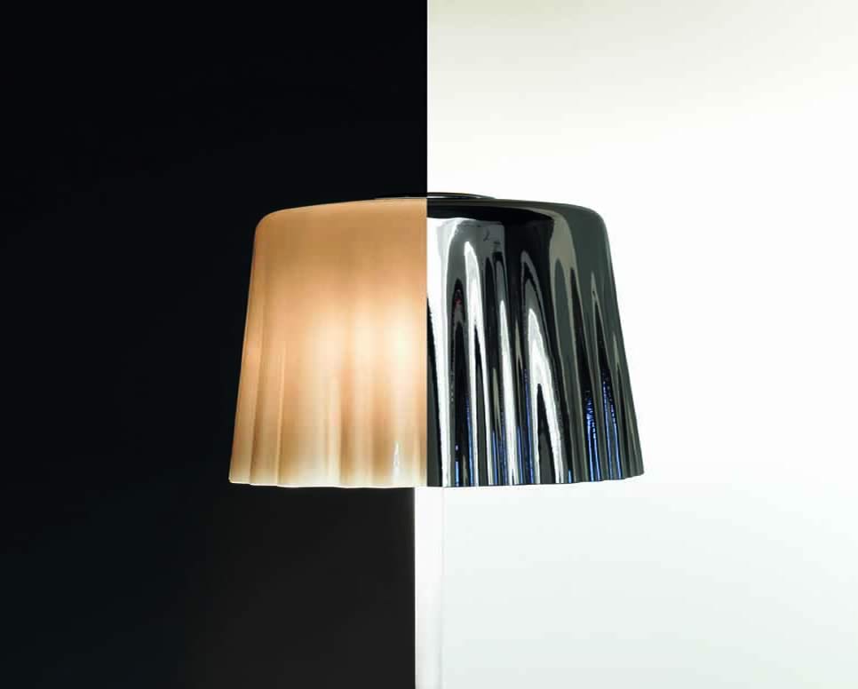 Staande lampen van geblazen glas met plissé effect. De lampen zijn in de kleur wit/satin of wit/chroom beschikbaar. De versie wit/chroom verschijnt "aan" in het wit en "uit" komt er een metalen glans - chroom - te voorschijn.