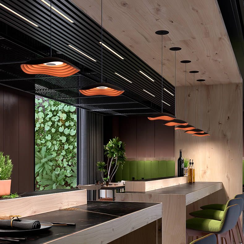 Het concept van deze lamp is gebaseerd op een gladde oppervlak met een golvende rand en het contrast met de binnenkant: kleine golven veroorzaakt door de zee.